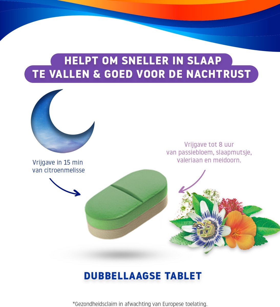 - Duel release tablet laag 2: Vrijgave tot 8 uur van passiebloem, slaapmutsje, valeriaan, meidoorn en vitamine B12