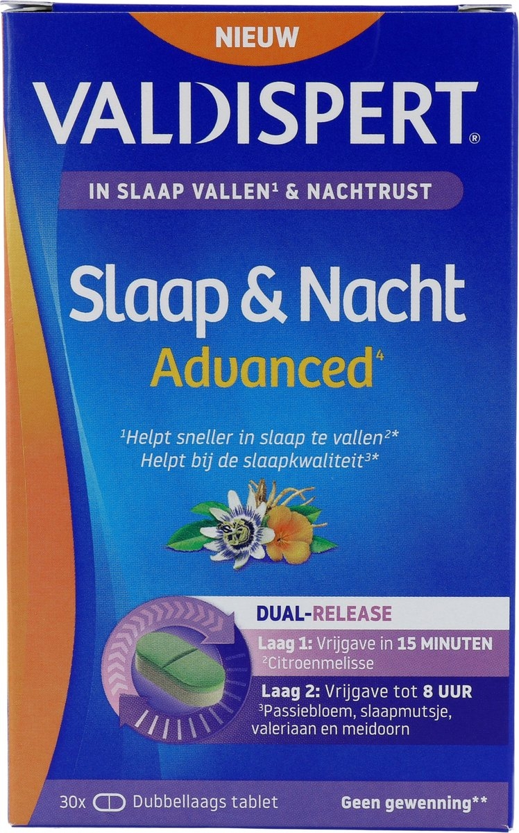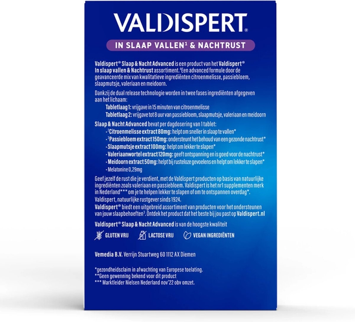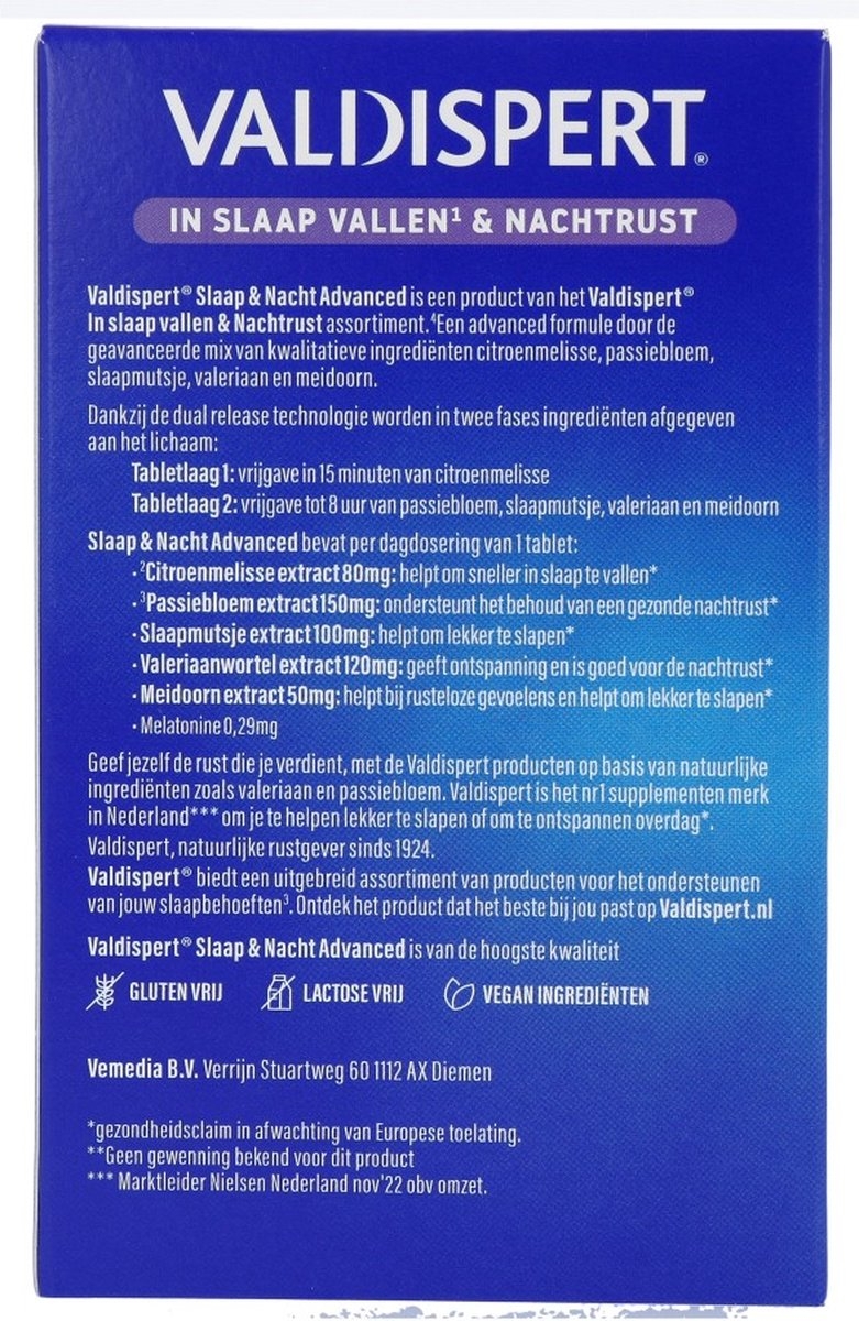 Valdispert Slaap & Nacht Advanced helpt om sneller in slaap te vallen door citroenmelisse* en ondersteunt het behoud van een gezonde nachtrust door passiebloem*. Dit product is onderdeel van het Valdispert In slaap vallen & Nachtrust assortiment. Een advanced formule door de geavanceeerde mix van kwalitatieve ingrediënten citroenmelisse, passiebloem, slaapmutsje, valeriaan, meidoorn en vitamine B12. Dankzij de dual release technologie worden in 2 fases ingrediënten afgegeven aan het lichaam: tabletlaag 1 geeft vrijgave van citroenmelisse in 15 minuten en tabletlaag 2 geeft vrijgave tot 8 uur van passiebloem, slaapmutsje, valeriaan, meidoorn en vitamine B12.