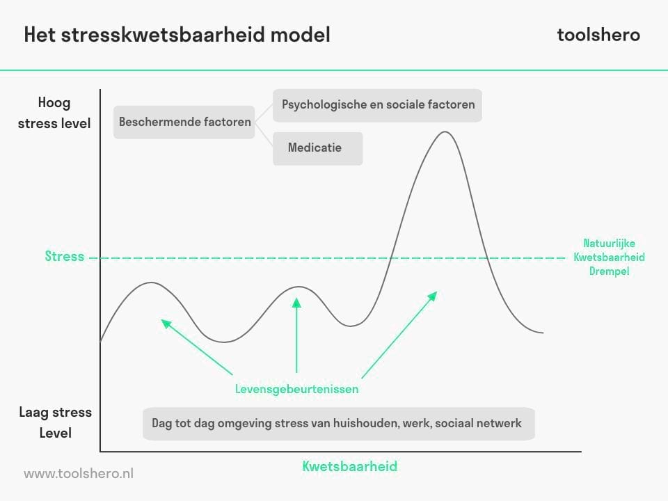 Het stress-kwetsbaarheidsmodel legt uit dat psychische klachten ontstaan door een combinatie van biologische aanleg en externe stressfactoren. Mensen verschillen in hun kwetsbaarheid: sommigen hebben een hogere genetische aanleg, waardoor ze sneller last krijgen van psychische problemen onder druk. Het model benadrukt dat zowel persoonlijke kwetsbaarheid als omgevingsstress bepalen hoe iemand reageert. Door deze inzichten kun je beter begrijpen waarom bepaalde situaties bij sommigen meer impact hebben en hoe preventieve strategieën of therapie kunnen helpen om stress en klachten te verminderen.